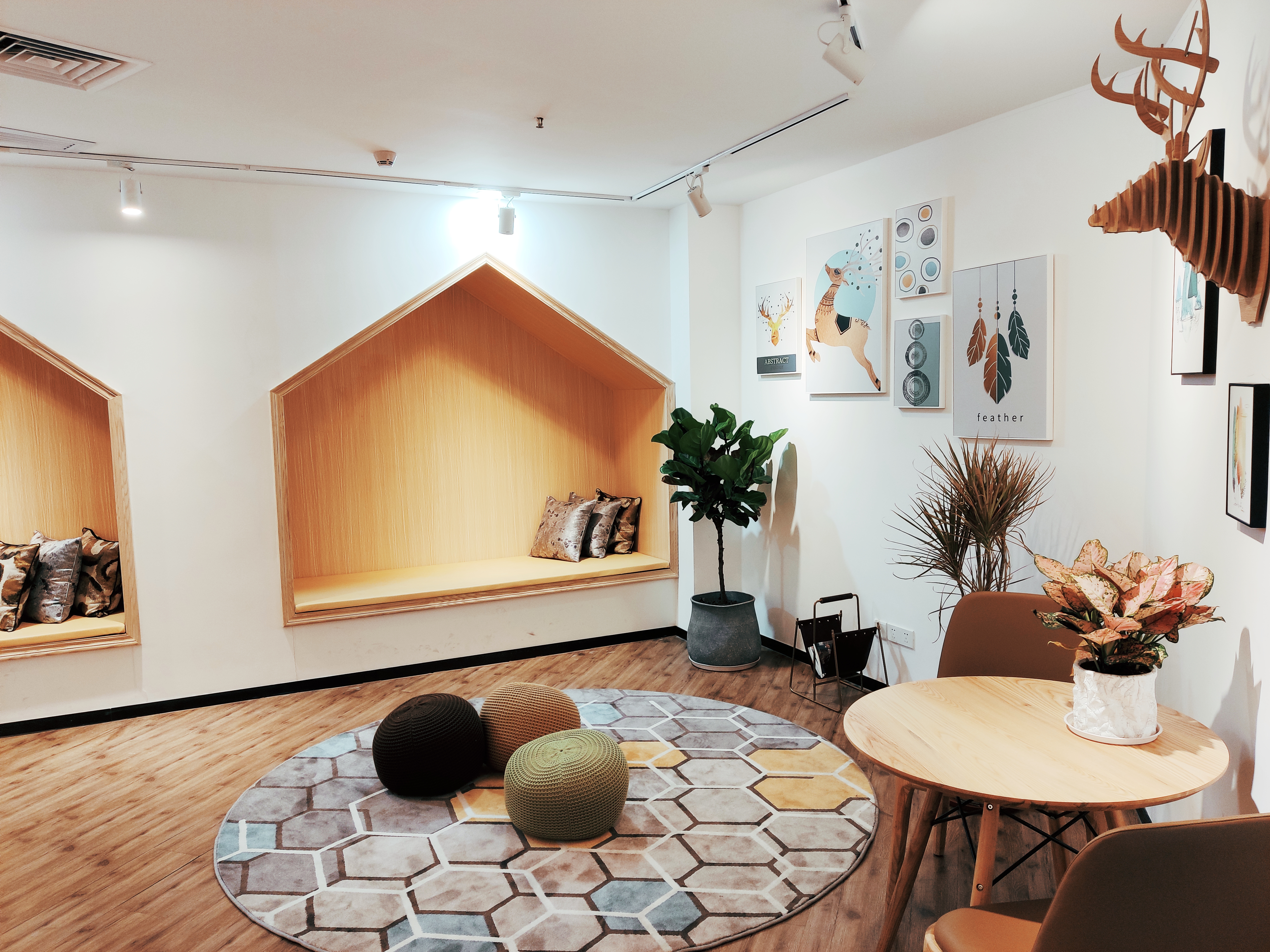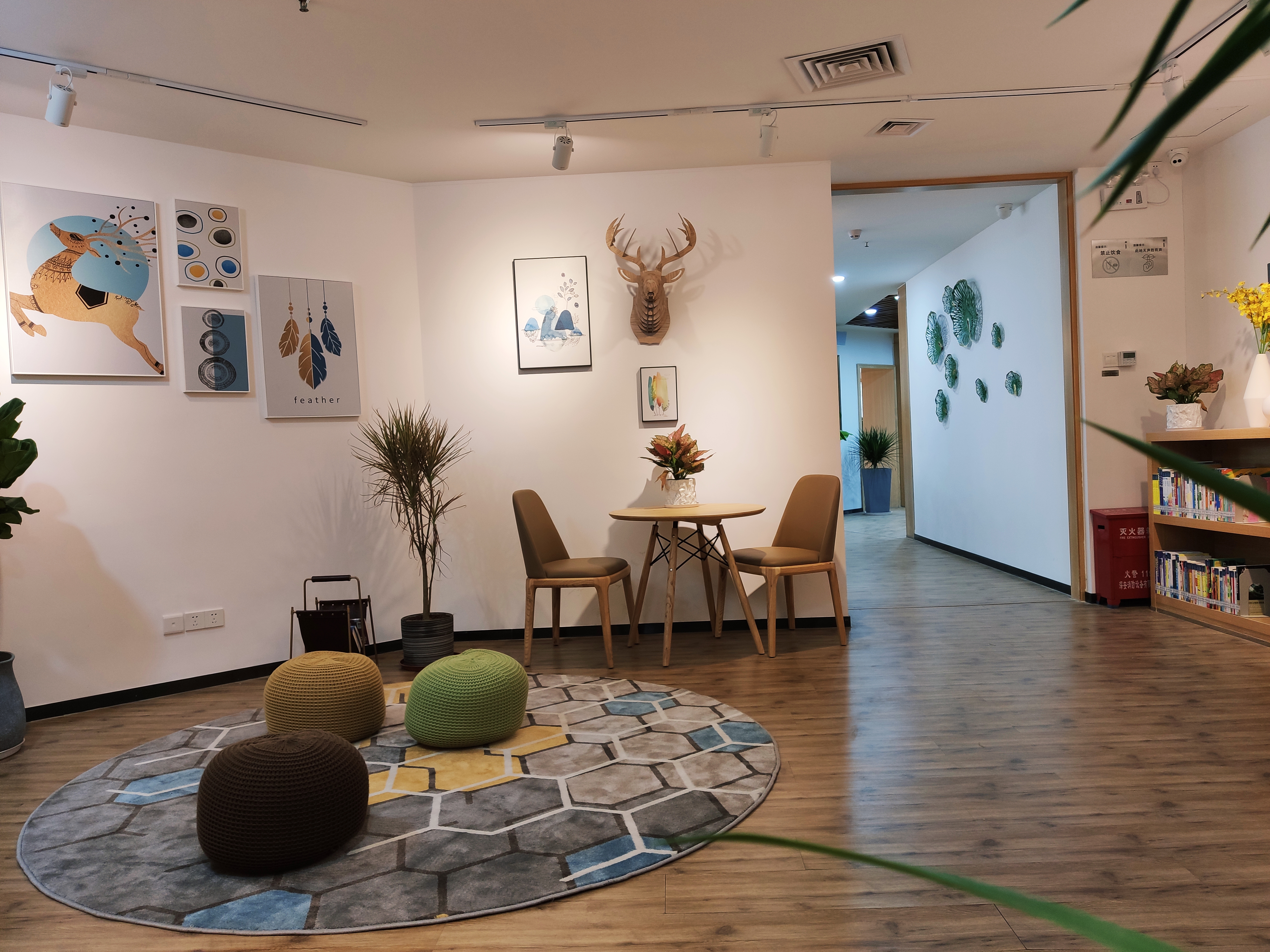 每个悠•图书馆都会根据自身的特点进行设计装饰,通过灯光、书架、地板、座椅等细则去营造舒适优雅的环境来吸引更多读者来图书馆读书阅览。从空间氛围上来看,舒适性是悠·图书馆第一大特点。其一改传统社区图书馆带给人们的刻板、冷清的印象,更像一间可以随意躺卧,处处流露出趣味和雅致的社区书房。此外,高度的互动性是其另一特点。悠·图书馆在空间设计上更多借鉴了书吧和现代书店的设计思路,冰冷的铁质书架和大量老旧的图书不再占据其主要的空间,悠然、随意、自由的空间设计,方便读者随意交谈和交流,甚至提供举办小型展览和沙龙的空间,显示了“人”取代“书”才是悠·图书馆在空间营造中最关注的要素。